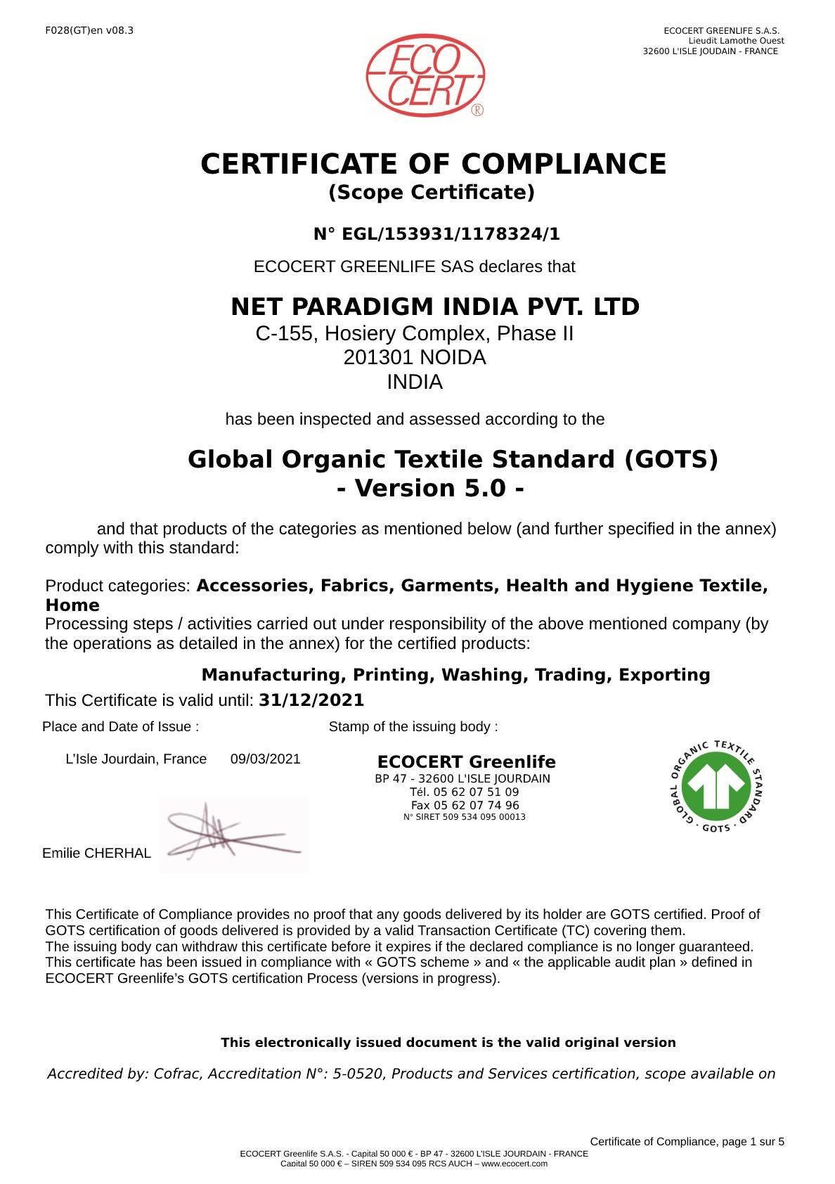 A third party transaction certificate can be requested by the customers from us. This certificate is issued by GOTS and is proof that the goods made for a particular order are made under organic standards.